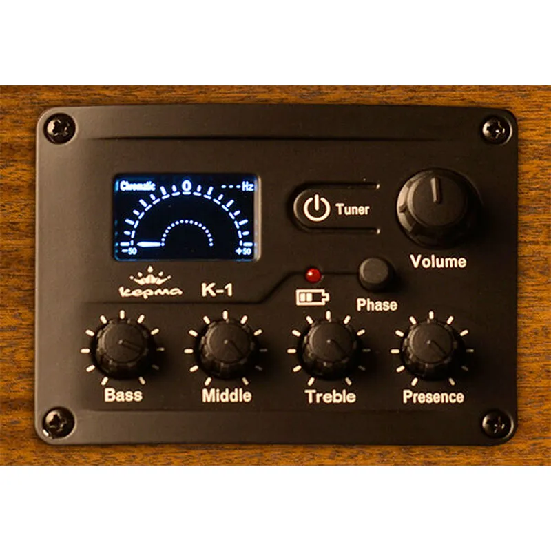 Электроакустическая гитара KEPMA EDCE оборудована классическим пьезо-звукоснимателем с предусилителем KEPMA K1.Предусилитель питается от стандартной 9В батареи типа крона и имеет встроенный хроматический тюнер, ручку громкости, 4-полосный эквалайзер Bass, Middle, Treble, Presence, а также кнопку Phase Shift и индикатор заряда батареи.